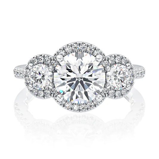 A.Jaffe Three Stone Round Center Diamond Engagment Ring with Round Diamond Halos