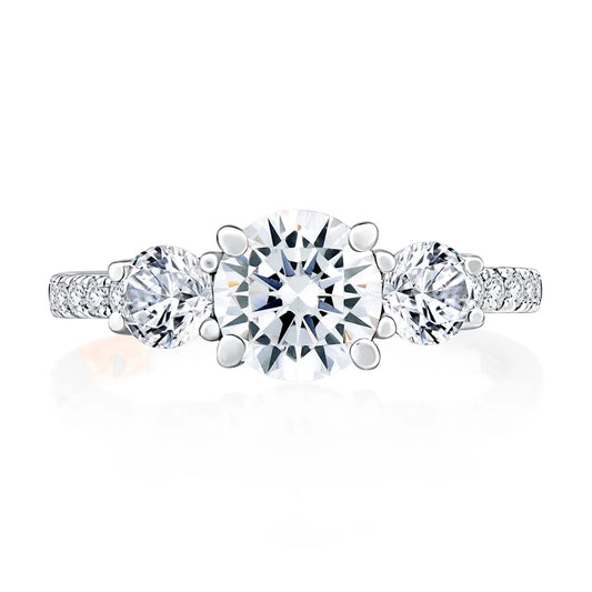A.Jaffe Three Stone Round Center Diamond Engagment Ring with Round Diamond Halos