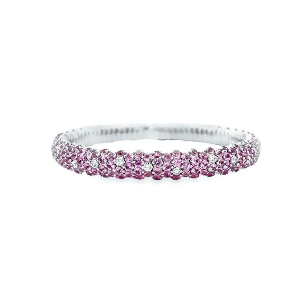 Exquisite 18k gold domed stretch bracelet available in rose or white gold, showcasing vibrant gemstones and sparkling round diamond accents. Choose from pink sapphires (12.36cts) with diamond accents (.88cts) or blue topaz (13.11cts) with diamond accents (.84cts), creating a colorful and eye-catching look. F/VS quality ensures exceptional brilliance and elegance.