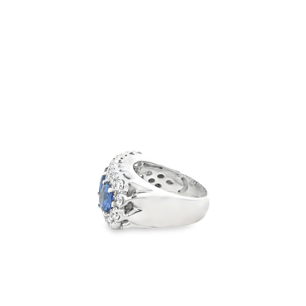 This exquisite 18kt white gold ring features a classic three-stone design with a total diamond weight of 2.10 carats, complemented by a 2.67-carat cushion-cut sapphire, showcasing refined elegance and expert craftsmanship.