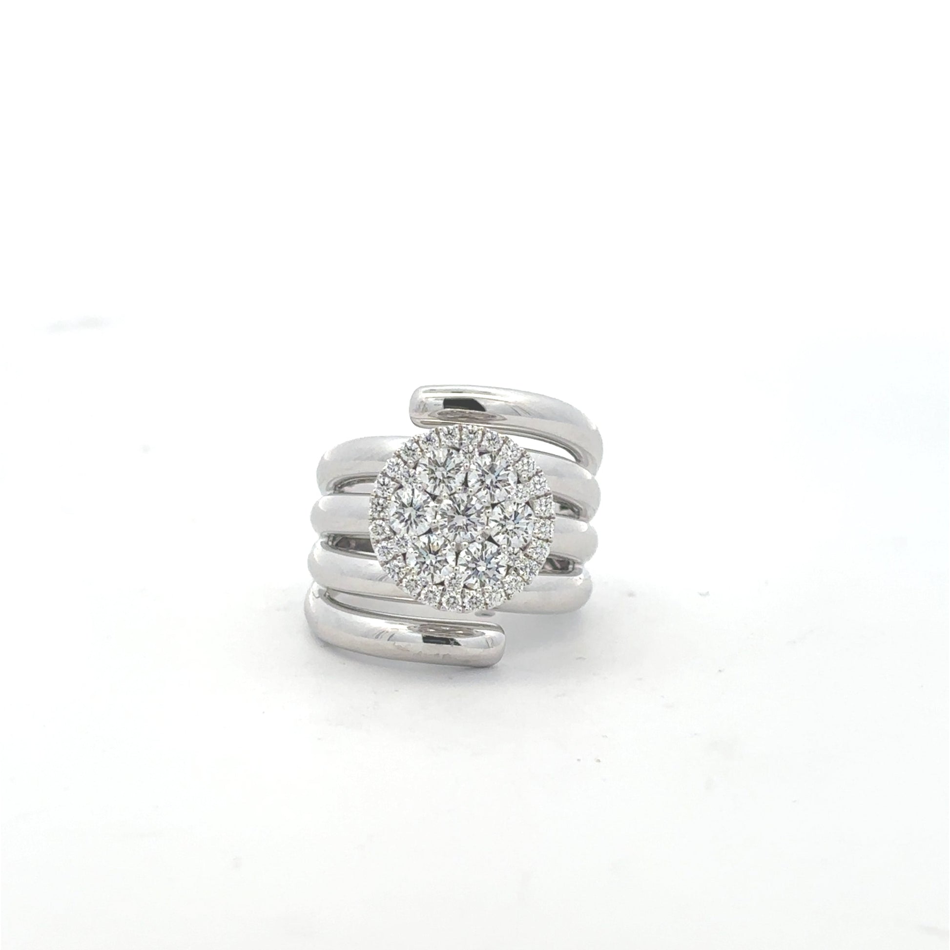 The Damaso 18kt white gold ring showcases five meticulously crafted rows of diamonds, totaling 1.31 carats. Measuring 19.5 mm in width, this piece combines substantial presence with refined elegance. Expertly designed, it delivers both luxurious sparkle and durable wear, making it a sophisticated choice for discerning jewelry collectors.