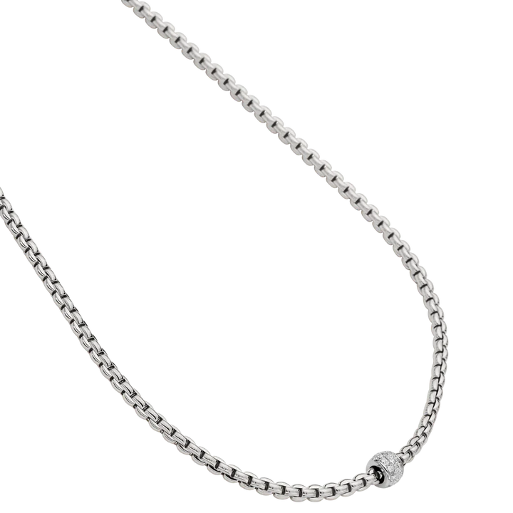 Flexible necklace entirely made of 18k white gold with white gold rondel and diamond pave'. Total diamond weight 0.19cts. Necklace length 17 inches.
