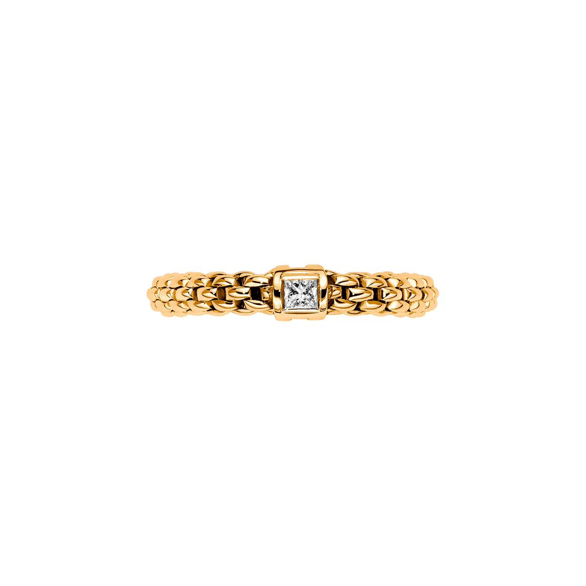 From designer FOPE's Souls Collection, 18 karat yellow gold diamond ring featuring flex'it technology. This ring is crafted with a bezel set 0.09 carat princess cut diamond. This ring is a size 6.5