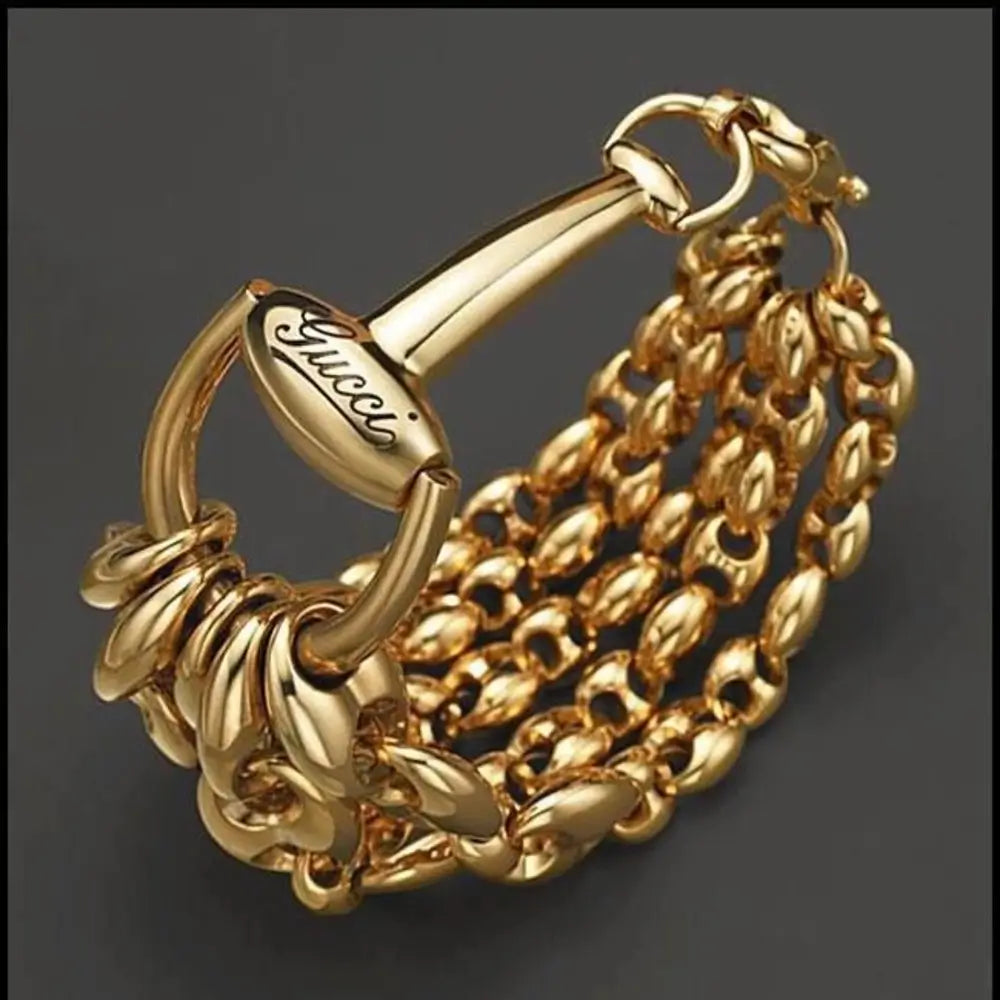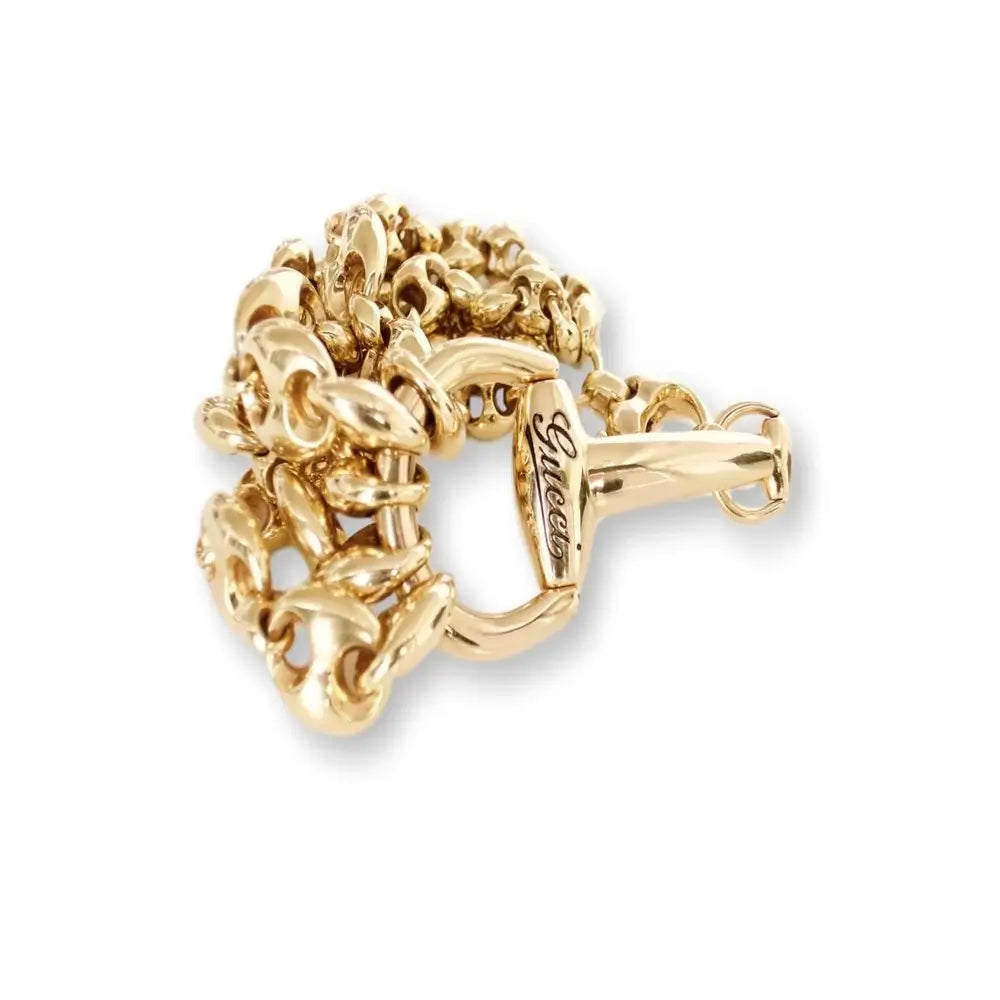 18k Yellow Gold Gucci Link Bracelet is made up of six marina link chains in various sizes. Big and Bold, this bracelet sits comfortably on the wrist. Approximately 6-7". Fits most wrist sizes.