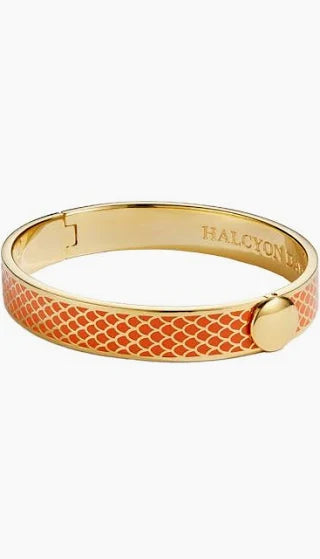 The Salamander Orange Gold enamel hinged bangle measures 1mm wide and is easy to match, feminine to wear and the perfect accessory for any occasion, either as a single item or when stacked with other bangles. The understated, elegant design is finished in 18k gold plate and features the Halcyon Days branding on the inside.